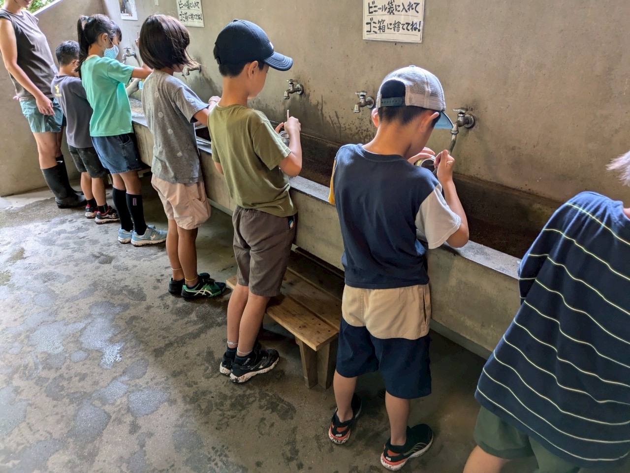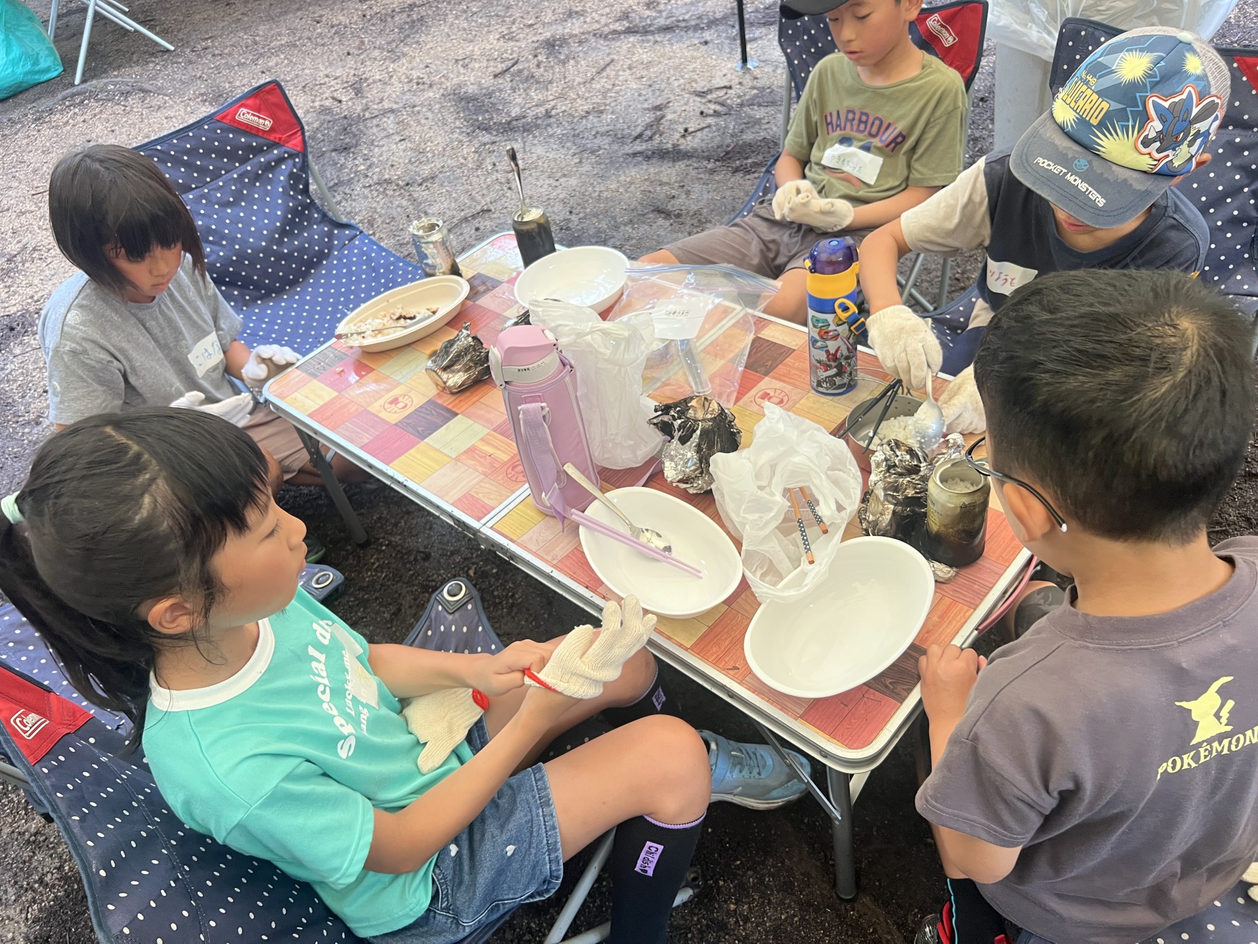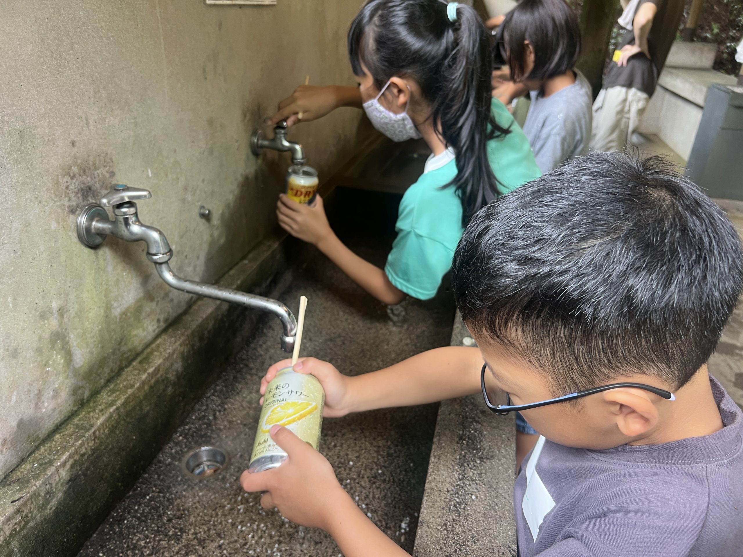 まずは、アルミ缶にお米を炊く準備、お米洗いに挑戦しました〜!