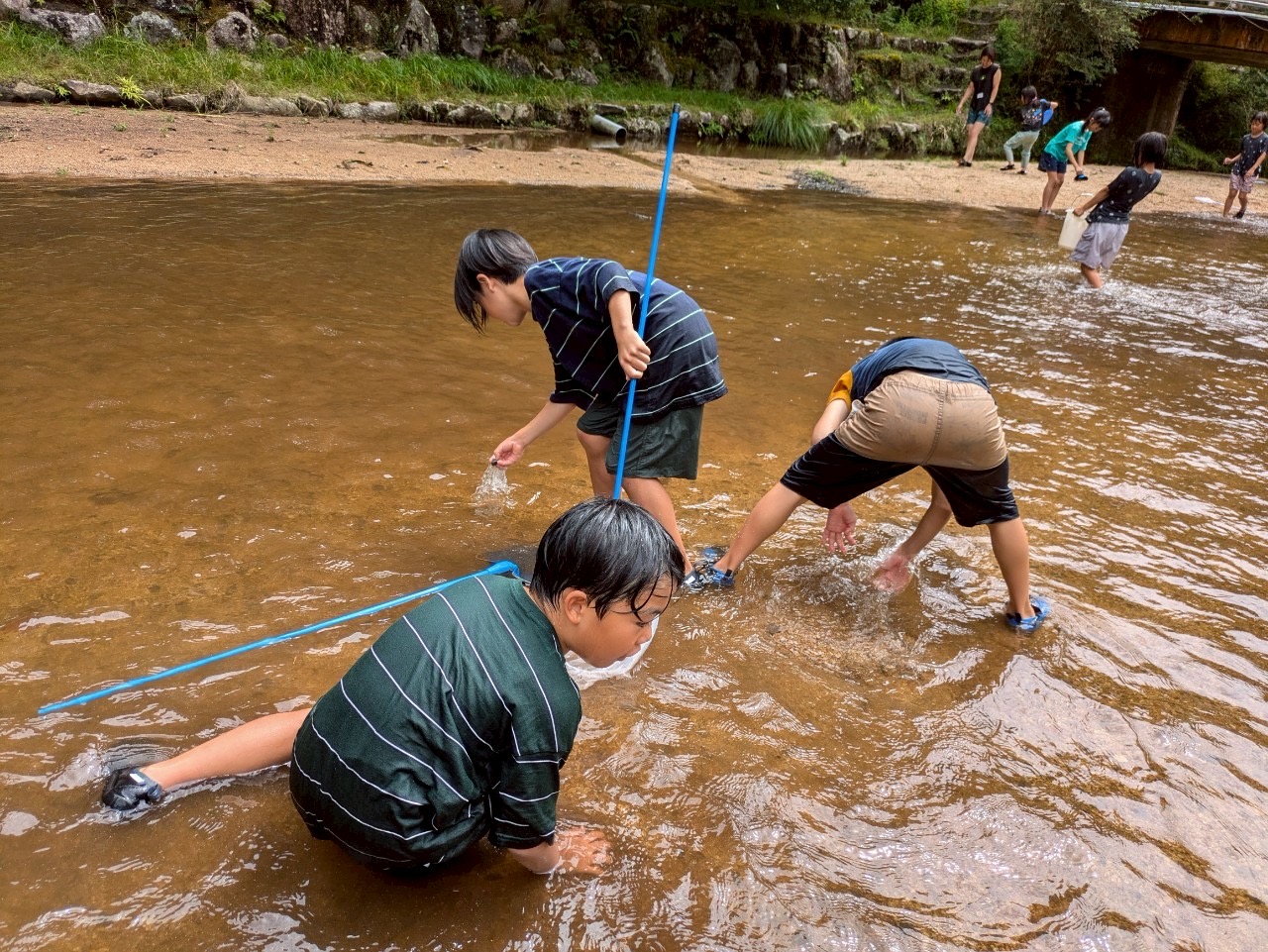 魚を見つける子、掛け合ったり、鬼ごっこしたりと、川の中で思い思いの遊び方で楽しみました!
