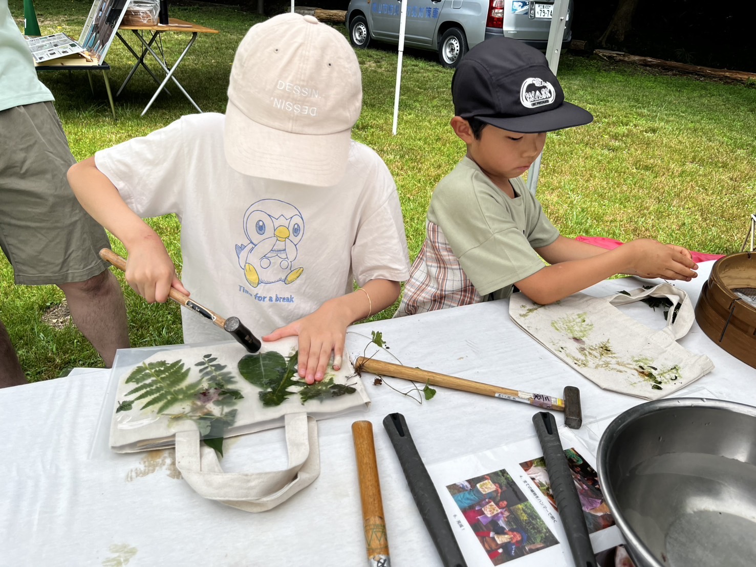 ★こちらはサバイバル植物図鑑づくり、草木たたき染めワークショップ