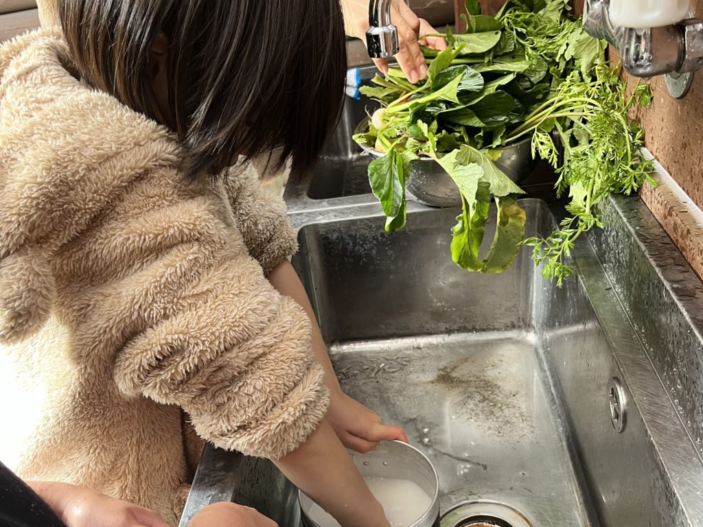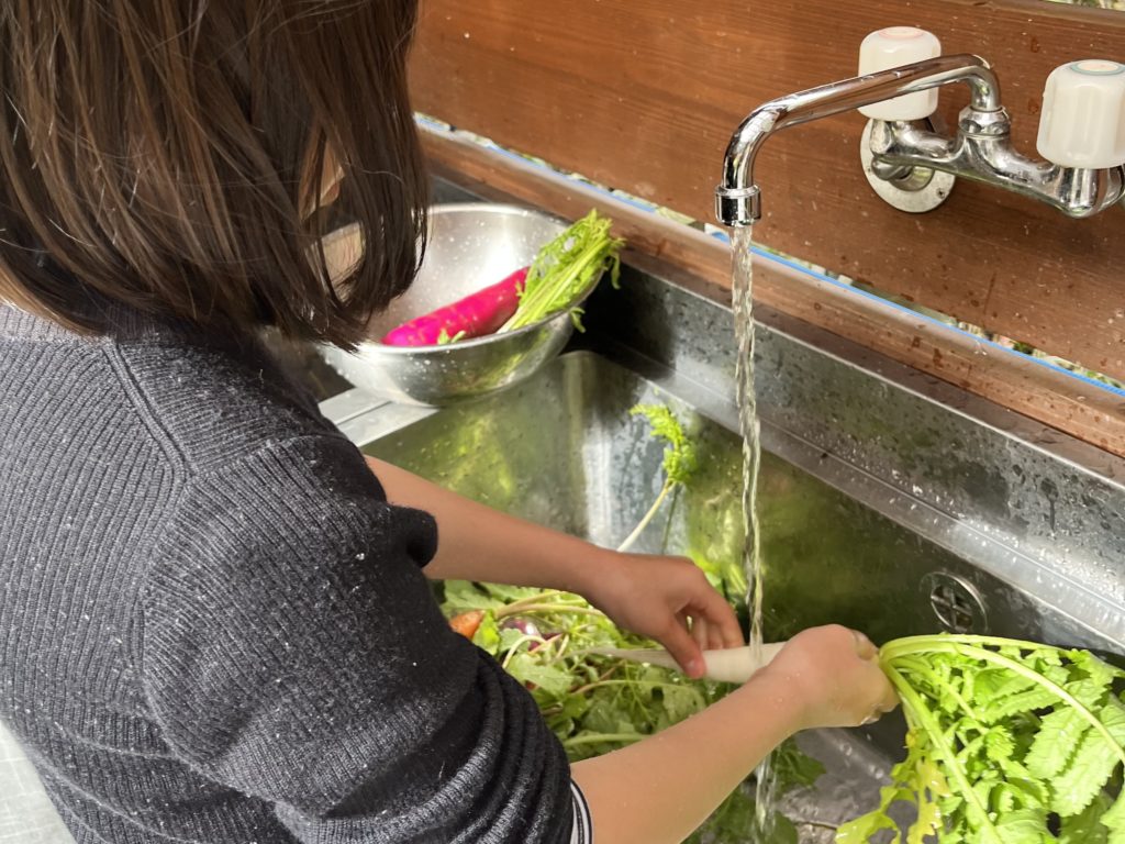 採れたての無農薬野菜たちは土だけじゃなく虫がついてることがあるのでひとつひとつ洗っていきます〜