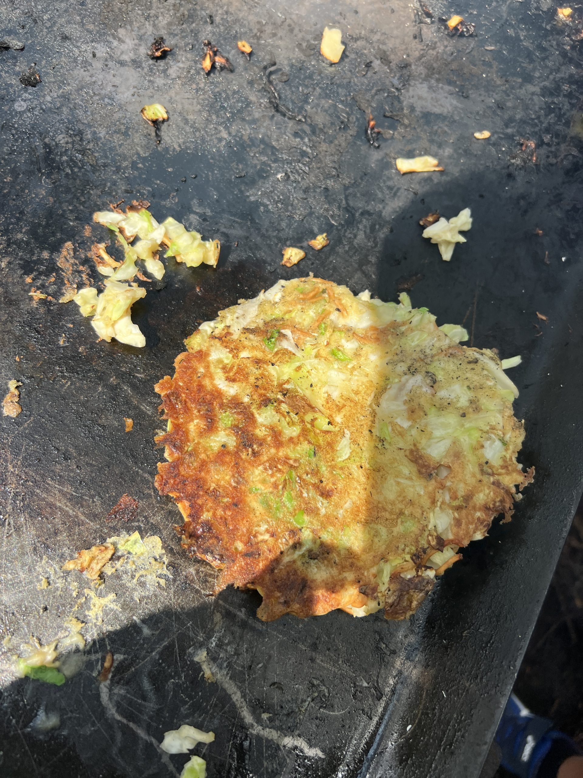 お好み焼きの中には、ベビースターラーメンを入れて〜鉄板で焼き焼き〜
