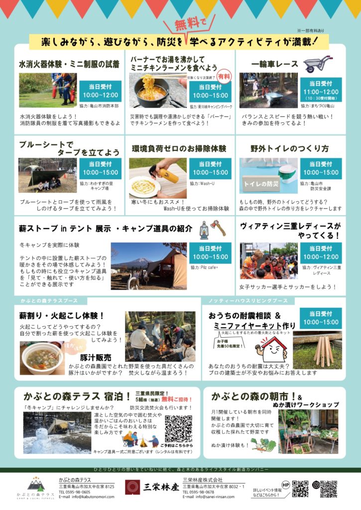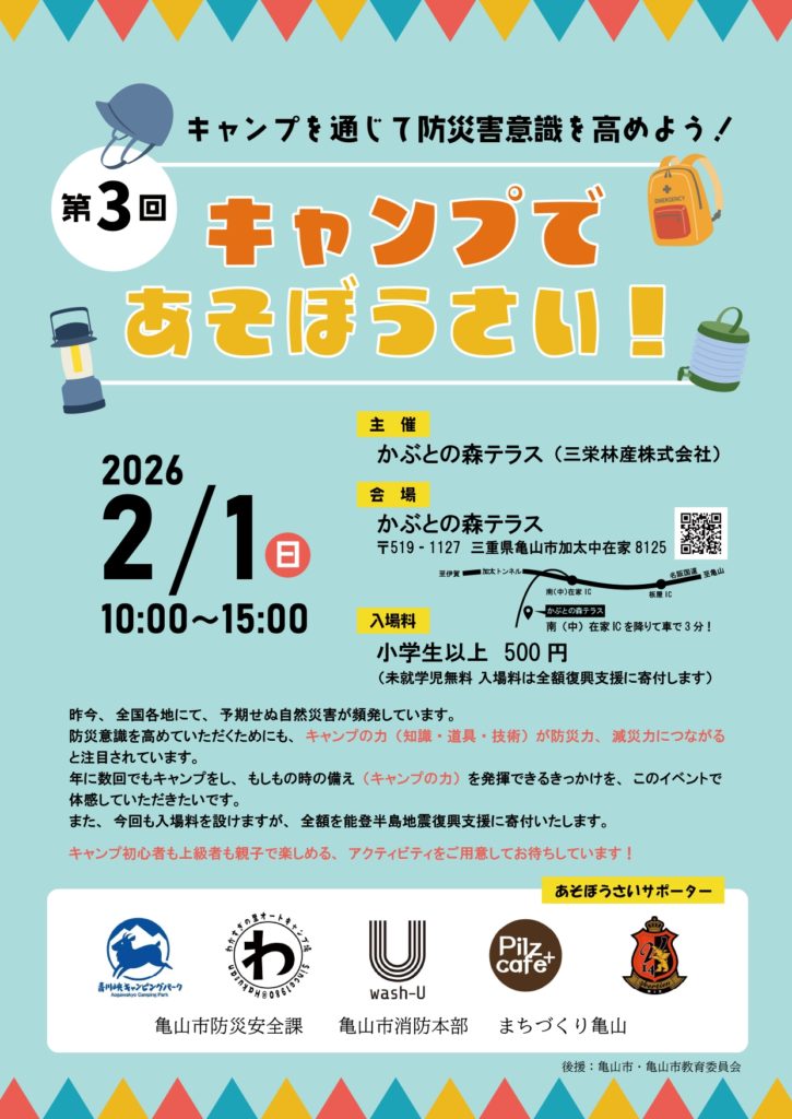 かぶとの森テラスでは第3回目となる「キャンプであそぼうさい」と題して、防災キャンプイベントを開催します!