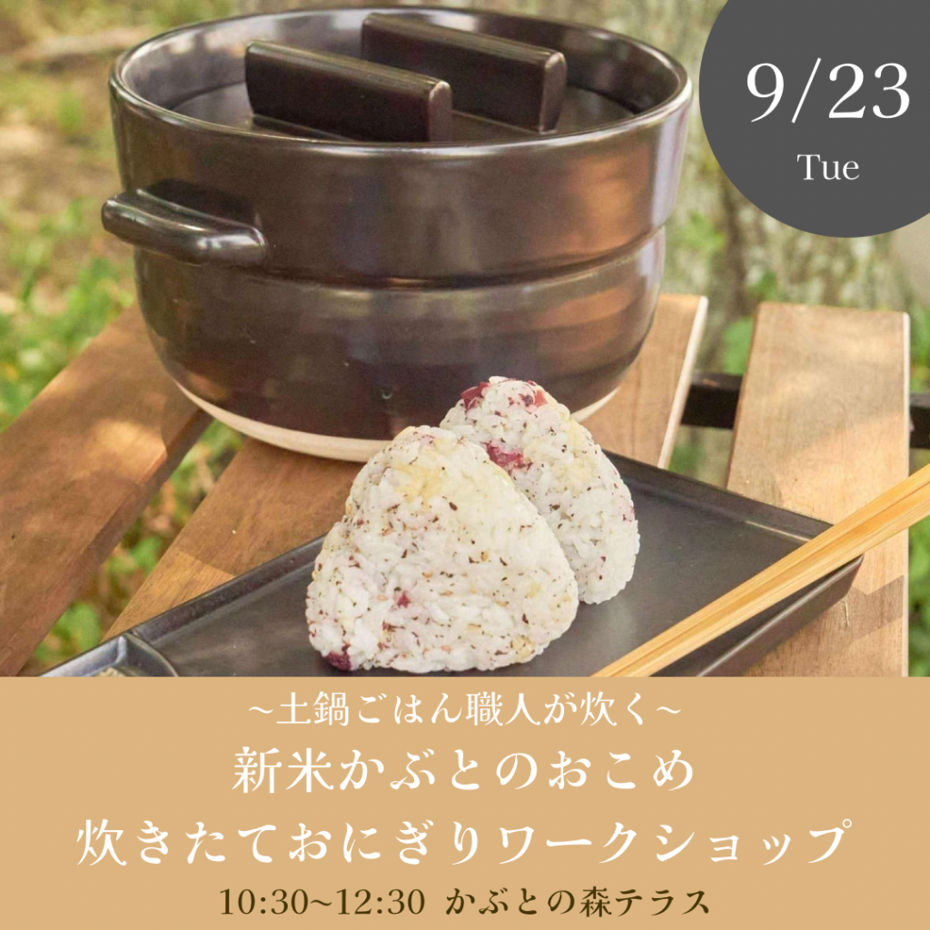 今回はかぶとの森テラスで、新米かぶとのおこめを使った土鍋の炊きたてごはんのおにぎりの振る舞いとおにぎりワークショップを開催していただきます。