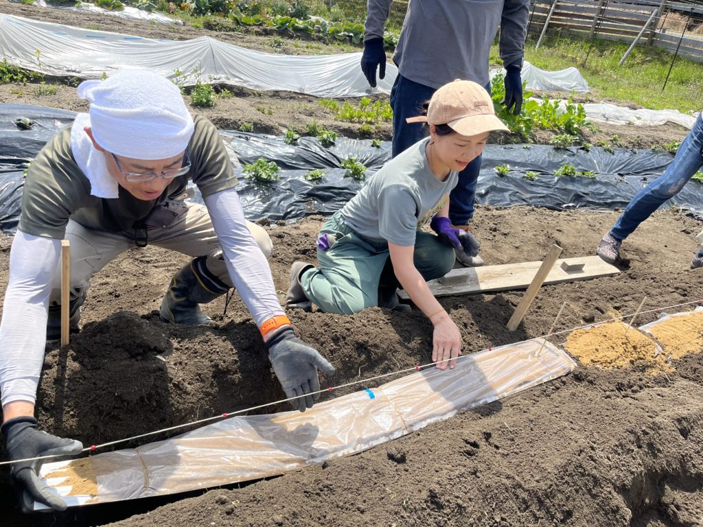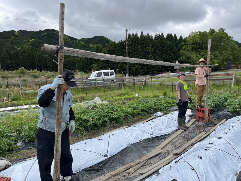 それまで畑を持っていなかった私たち。キャンプ場の近くの耕作放棄地を開拓するところから始めました。そして農業の経験がほとんど無いところから、自然薯農家さんに一から植えつけ方法、土づくり、自然薯を育てるための支柱の建て方を教わりました。