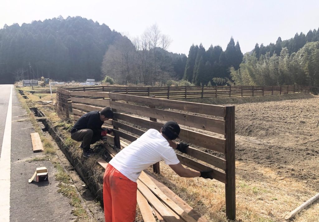 加太は鹿や猿などに野菜が食べられてしまう、獣害が多い地域。そのため、畑に野生動物が侵入しないよう、地域の方にご協力いただき、畑の周りに木の塀と電気柵を全て手作業で取り付けました。