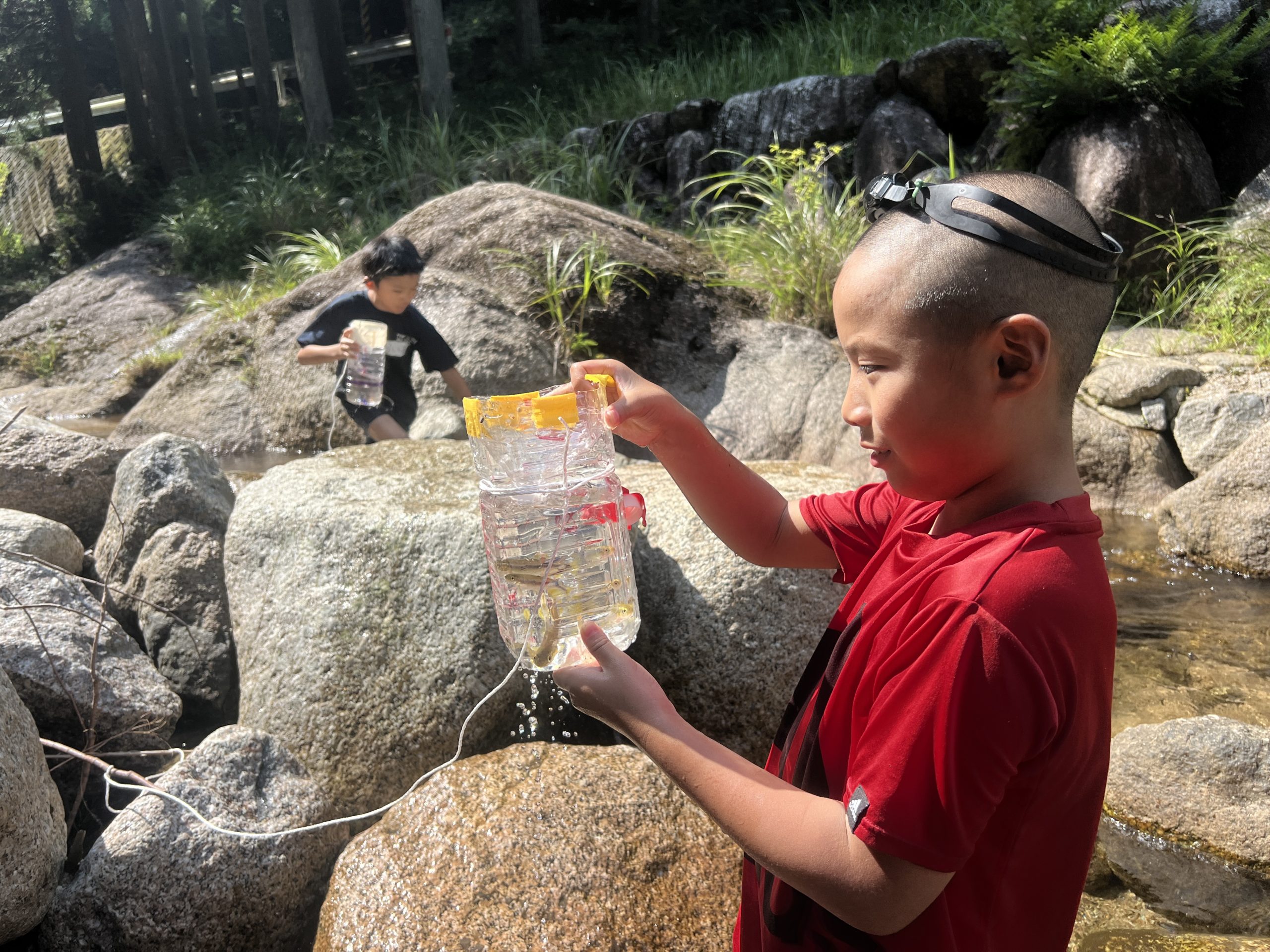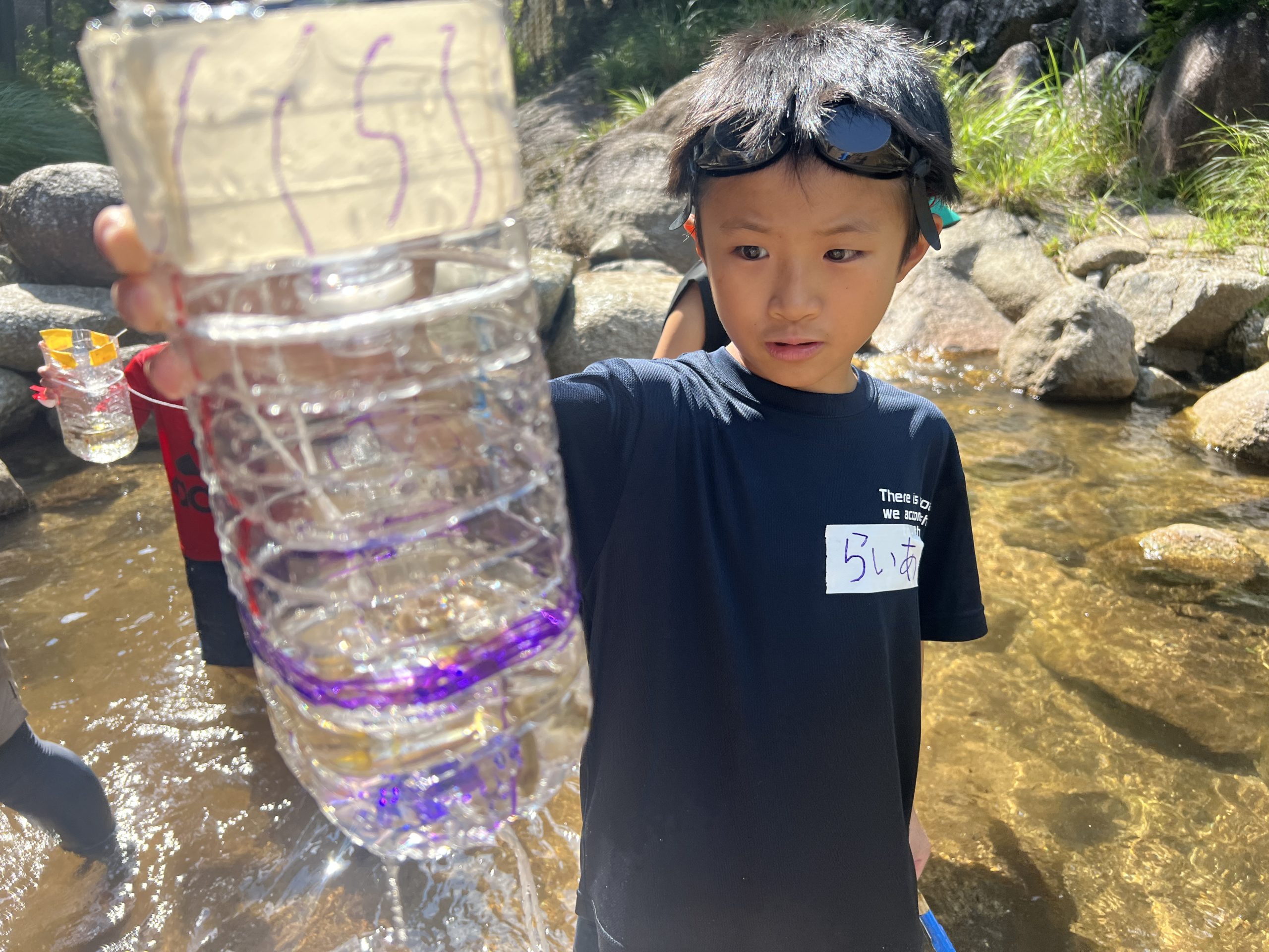 作ったペットボトルの仕掛けを、川へ仕掛けに行き、